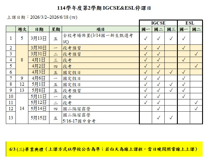 | 公告內容 | ■IGCSE 國際學程班 & ESL 專班為 一學年制課程,課程不會寄發下學期繳費單,亦無須重新報名,開始上課日:3/2(一) 請家長與學生留意 eClass 系統訊息,詳細請參閱附件 |
